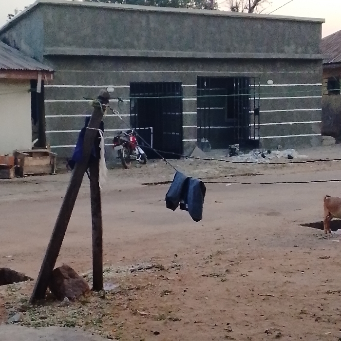 A weathered wooden post stands angled, supporting a clothesline strung across a dirt street