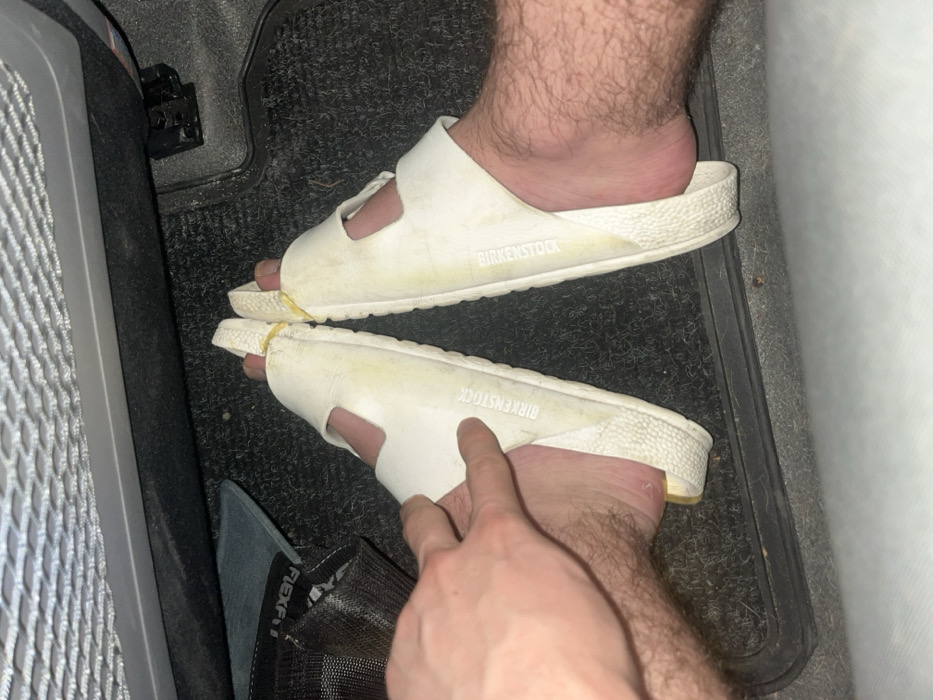 This image depicts a downward view into the interior of a vehicle, located in the city of Azor, Israel. The primary subjects are a person's bare, hairy lower legs and feet, adorned with two white Birkenstock brand EVA sandals. Both sandals display wear, dirt, and discoloration. Yellow rubber bands are present, wrapped around the front strap of each sandal, positioned near the toes. A person's bare, hairy hand, with visible knuckles, is extended into the frame from the left, with the index finger making contact with the inner side of the left sandal. The feet and sandals rest on a dark, textured vehicle floor mat, which shows some visible debris. In the upper portion of the image, a grey mesh fabric, consistent with a vehicle seat-back pocket or storage net, is visible. To the left, a black mesh object, possibly a bag or cap, with partially visible white text "FLEXF", rests on the floor mat. A dark metallic structure, likely a seat rail, is visible on the upper right side of the floor.