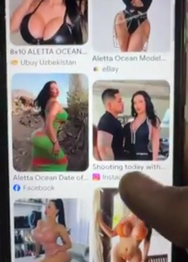 A smartphone is displaying an image search result for “Aletta Ocean.” A finger scrolls over the screen, showing thumbnails of various images featuring the same woman in lingerie or swimwear. Links to the images lead to different websites like UBuy, eBay, Facebook, Instagram, and Threads.