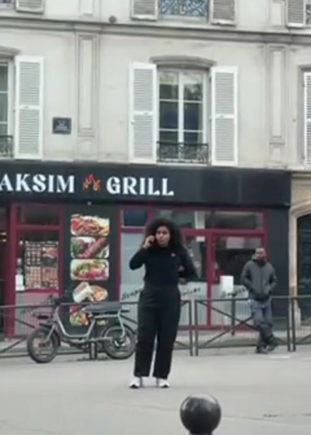A young woman stands on a city sidewalk talking on a cell phone, in front of a restaurant called "Taksim Grill." She is wearing a black sweatshirt and pants with white sneakers. Behind her, a man leans against a fence. A motorcycle is parked to the side. Two pedestrians walk past her. The building has a stone facade and multiple windows with white shutters. The scene is shot from across the street.