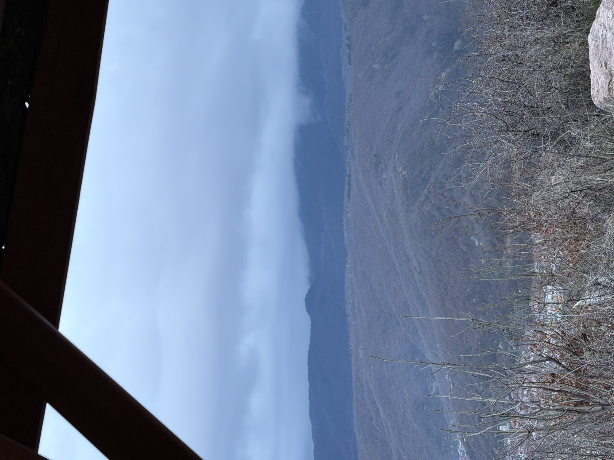 landscape view from a building or structure, possibly in the Sveti Konstantin area of Bulgaria. The foreground features the angled wooden supports of a building. Beyond that, the landscape consists of a mountain range shrouded in mist or low clouds. The terrain is rugged, with visible bare trees and foliage in the middle ground. A large rock is visible on the right side. The sky is overcast, contributing to the overall somber tone of the scene. No people are visible.