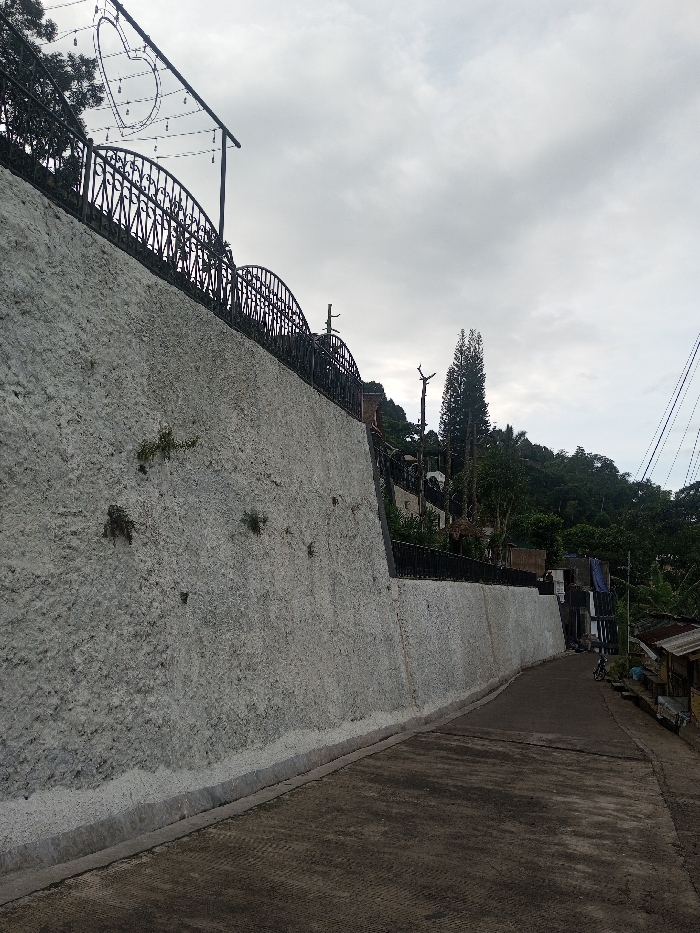 A high, textured concrete wall, topped with decorative black wrought iron fencing, dominates the left side of the frame. The wall lines a narrow asphalt road that curves upward. Lush green trees and vegetation cover the hillside in the background. Several houses and structures are visible amidst the trees, suggesting a residential area built on a slope. The sky is overcast, casting a soft, diffused light over the scene.