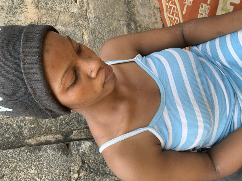 A young adult female is depicted in Minna, Nigeria, seated or reclined against a rough, weathered grey concrete or stone wall. She wears a dark grey knit beanie, partially obscuring her hair, and a light blue and white horizontally striped, ribbed sleeveless top with thin spaghetti straps. Her eyes are closed or cast downwards, and a small dark mark is present on her nose. Her complexion is dark. A patterned orange fabric with white geometric designs is visible on the surface to her right. No other individuals or direct interactions are observed. The scene is illuminated by natural light.