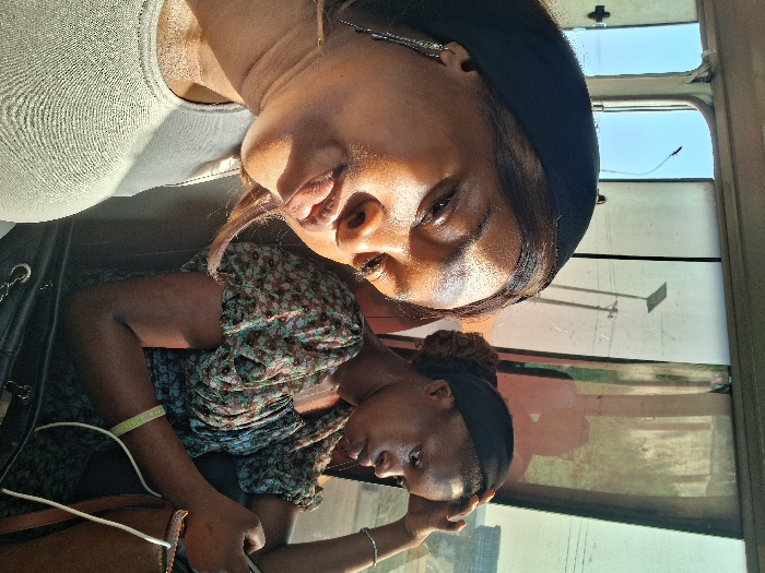 Two women are in a vehicle. The woman in the floral dress and black headband is turned away from the camera. The other woman is facing the camera with a white top and black headband. A glimpse of the outside shows an electric post and blue sky. The background includes vehicle windows and door frames.