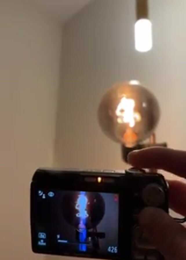 A person holds a black Olympus digital camera, pointing it at a room with two light sources. The camera's screen displays a blue-tinged image of a large, round, old-fashioned incandescent light bulb on a stand, which is also visible in the room. Above it, a modern, vertical, cylindrical light fixture with two white bulbs and a brown middle section is hanging from the ceiling. The walls are a neutral, light color. The camera is slightly shaky, and the person is likely taking a picture of the light bulbs.