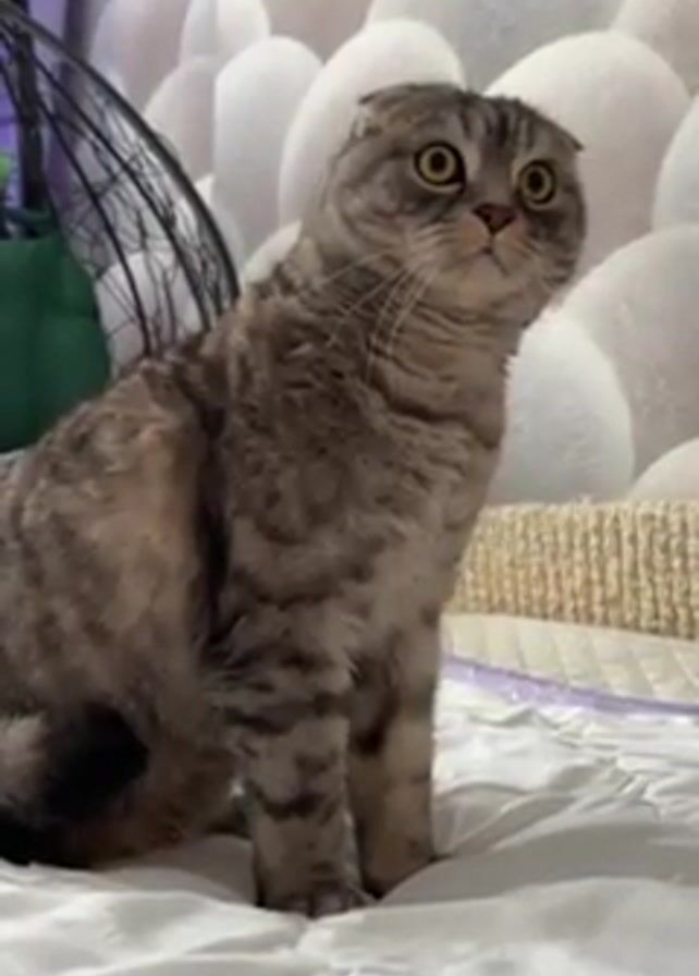 A short video shows a brown tabby Scottish Fold cat sitting on a white blanket