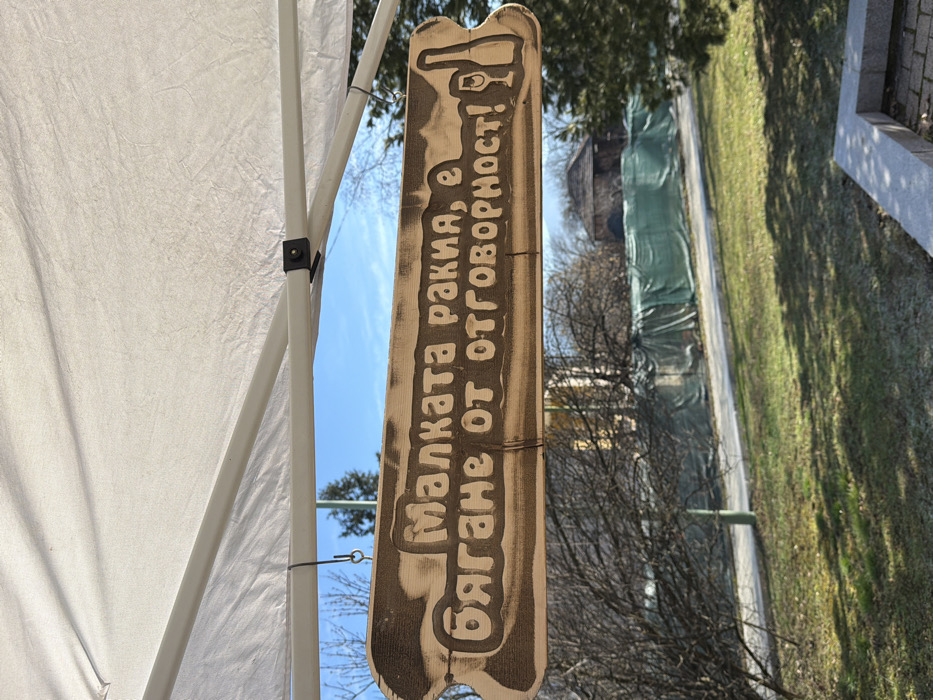 The image depicts a carved wooden sign, horizontally oriented, suspended from the internal metal frame of a white canvas canopy tent. The sign features dark, incised Bulgarian Cyrillic text: "Малката ракия, е бягане от отговорност!", which translates to "A small rakia, is an escape from responsibility!". To the right of the text, an etched outline of a bottle and a stemmed glass is visible. The sign is attached to a white metal pole of the canopy structure via a dark metal hook. Below the sign, an outdoor environment is visible under a clear, bright blue sky with minimal cloud cover. In the midground, a patch of green grass, partially illuminated by sunlight, extends towards a light-colored paved pathway or road. Beyond the path, numerous bare deciduous trees and bushes are present, indicating a season outside of full foliage. A dark green tarp or netting stretches horizontally in the background, possibly covering a fence or structure. Above the tarp, a distant building with a dark, peaked roof and what appears to be wooden siding is faintly visible through the tree line. In the lower right foreground, a light grey concrete or stone border suggests a raised planter or low wall. The scene is located in Pravets, Bulgaria.