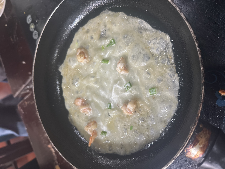 A close-up shot depicts a pan filled with a partially cooked omelet. The omelet is light in color with visible pieces of shrimp and sliced green onions scattered across its surface. The pan itself is black and shows signs of use, with some oil or residue around the edges. The omelet appears to be in the process of cooking, with a slightly wet or glistening appearance.