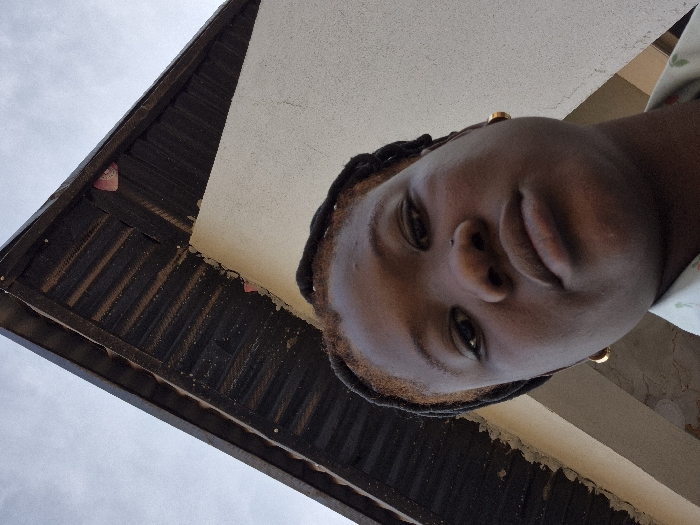 An upward-angled selfie captures a dark-skinned individual with a nose piercing and gold earrings. The subject is positioned against a background consisting of a corrugated metal roof and white ceiling. The sky is visible in the lower left corner of the frame. The lighting is subdued, highlighting the subject's features while obscuring details of the background. The image orientation is tilted, adding a dynamic element to the composition.