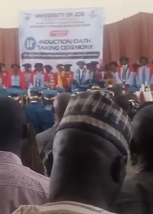 A medium shot taken from the back of a crowd shows an induction/oath taking ceremony for qualified medical laboratory scientists at the University of Jos. Many graduates are standing on the stage, wearing caps and gowns. A speaker is at the podium. The crowd is facing the stage. A banner identifies the ceremony. There are brown curtains behind the stage. Some attendees are wearing traditional Nigerian hats.