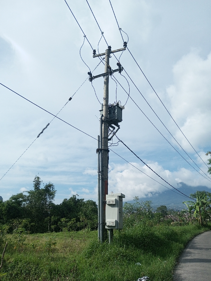 An electrical pole dominates the frame under a sky with scattered clouds. Power lines extend from the top, adorned with insulators and a transformer halfway down. A grey electrical box is near the base of the pole. Lush green grass surrounds the base and extends into the background, where various trees and shrubs are visible. A paved road curves into the right edge of the frame. In the distance, hints of a mountain and buildings can be seen.
