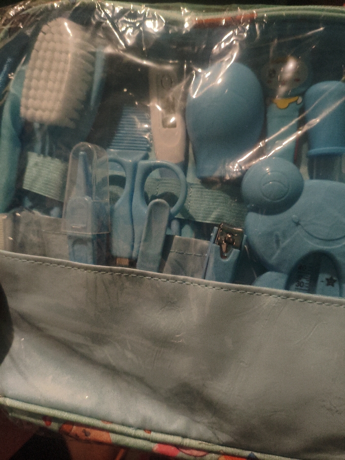 - "The image displays a comprehensive baby grooming and healthcare kit, presented within a clear plastic zippered compartment of a larger travel case" by FM-pEKrz1, licensed under CC BY 4.0
