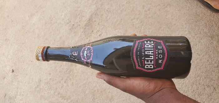 A dark-skinned human hand holds a tall, dark-colored glass bottle of Luc Belaire Rare Rosé sparkling wine