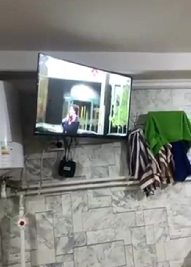 television mounted on a wall playing a scene from a movie or TV show. The wall has light grey, textured paneling. Below the TV, a small, black electronic device is connected with wires. To the left of the TV is a white water heater with a meter. To the right of the TV, several towels are hanging. The TV screen displays a woman in a blue blazer talking on a cell phone, then shows her getting into the backseat of a car. A man is also in the car. The camera focuses on the TV screen as the actors speak.