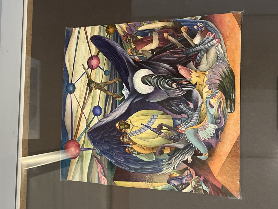 The framed artwork shows a surreal composition featuring a dominant dark bird with a white eye patch. Within the bird's wings and form are depicted people, some holding weapons. The background contains elements resembling molecular structures and abstract shapes. The color palette is a blend of muted tones with pops of red, blue, and orange. The overall effect is dreamlike and symbolic.