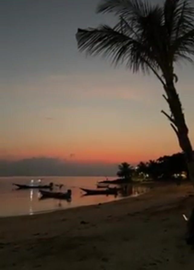 sunset on a beach. The sky is a gradient of colors, from dark blue at the top to orange and pink near the horizon. Palm trees silhouette against the sky. Several small boats are floating in the water near the beach. The sand is dark and wet. There are people visible on the beach, but they appear as silhouettes. The video appears to be filmed from a stationary position.