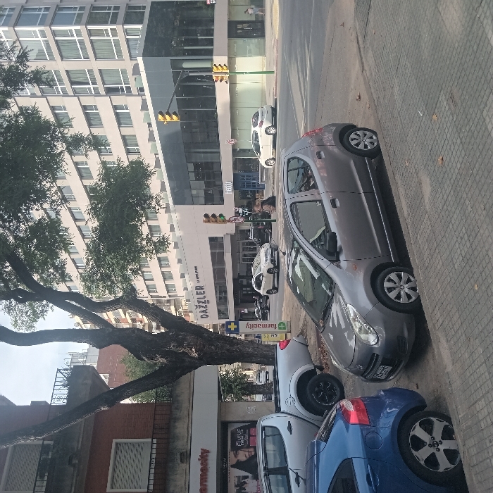 The image displays an urban street scene in Montevideo, Uruguay, under an overcast sky. In the foreground, a grey Suzuki Alto hatchback is parked on the right, parallel to a light grey paved sidewalk, with its front right wheel partially on the curb. To the immediate left, the rear of a blue hatchback is also parked. Behind these vehicles, a silver Mitsubishi L200 pickup truck is parked on the left. Adjacent to the pickup truck is a two-story building; its upper level features red brickwork and a balcony, while the ground floor houses a "Farmacity" pharmacy with large display windows. A tall, multi-branched tree with green foliage partially obscures this building and extends into the upper frame. A green pole with a white cross "Farmacity" logo stands near the tree. Across the street, a prominent multi-story, light-colored building with numerous windows dominates the background. Its ground floor features a commercial facade with large glass panels and a "DAZZLER BY WYNDHAM" sign. Below "Dazzler," the word "heli" is partially visible. An intersection is visible on the right, marked by two sets of vertical traffic lights displaying yellow indications. On the street, a white SUV and a dark SUV are present near the intersection. A white sedan is parked on the far side of the street. One individual in light clothing is seen walking away on the far right sidewalk, and two indistinct figures are visible near the entrance of the "Dazzler" building.