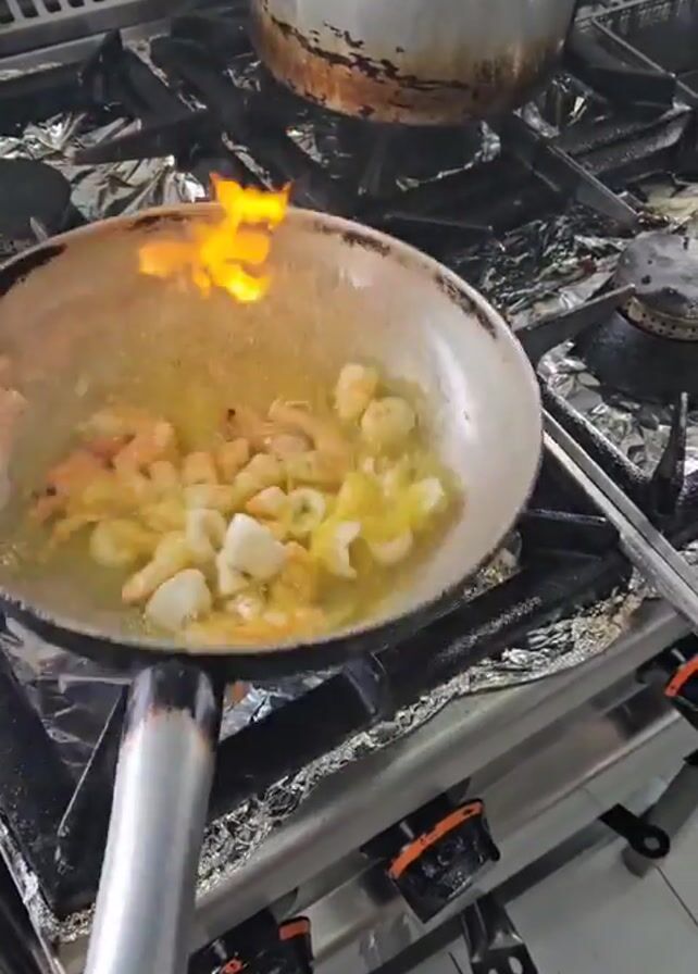 The camera remains static throughout the video. A round metal pan is visible, being held above a gas burner. In the pan, shrimp and calamari are sautéing in a light-colored liquid, likely oil or butter. The pan is vigorously shaken, causing the liquid to flambé. Behind the pan, another burner is lit, and a large, partially corroded metal pot sits on top of it. The stovetop area is covered in crumpled aluminum foil. The setting appears to be a professional kitchen.