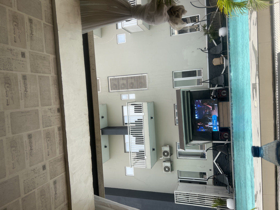 The image depicts an outdoor recreational area, specifically a swimming pool facility, located in the city of Unknown, Unknown. The scene is viewed from beneath a light-colored canopy patterned with vintage postcard designs. A white structural beam is visible horizontally across the mid-top of the frame, with a sheer white curtain gathered on the far right. In the immediate foreground, the top of an out-of-focus blue plastic water bottle is present. The central feature is a rectangular swimming pool with clear blue water, occupying the lower half of the midground. Beyond the pool, on a paved surface, an outdoor entertainment setup is visible. This setup consists of a large, dark-framed outdoor television screen, displaying what appears to be a musical performance, flanked by two large, dark speakers. To the left of this setup, a white slatted partition and a potted plant in a white planter are present. To the right, multiple dark lounge chairs, some appearing to be swing chairs, are arranged, with one light brown chair positioned between two dark ones. Additional potted plants in white planters are on the far right. In the background, a multi-story building with a light gray facade dominates. The building features various windows and architectural details, including a prominent white-railed balcony on the upper left, supported by a dark gray column. Two chairs are discernible on the balcony. Below this balcony, two outdoor air conditioning units are mounted on the wall. A tall, vertical slatted vent is visible on the building facade to the right of the balcony. The far left section of the building transitions into a darker, possibly black, color. The sky above the building is uniformly bright. No individuals are physically present in the visible portion of the scene.
