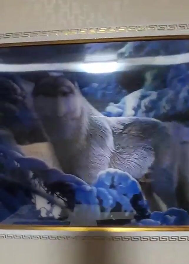 The camera shows a rectangular picture in a gold frame hanging on a white wall with a beige wallpaper pattern. The picture depicts a wolf in a snowy forest setting. The colors of the painting have a blue tint, potentially due to the lighting in the room. The camera lens is focused on the picture, zooming slightly in.