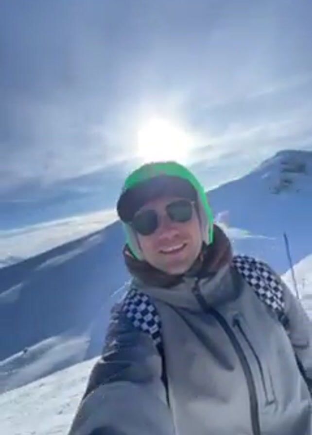 A person wearing sunglasses and a green helmet is skiing down a snow-covered mountain on a bright, sunny day. They are holding a camera and filming themselves, and are smiling at the camera. In the background, there are snow-covered mountains and a ski lift. The person is wearing a grey jacket with a checkered pattern around the hood.