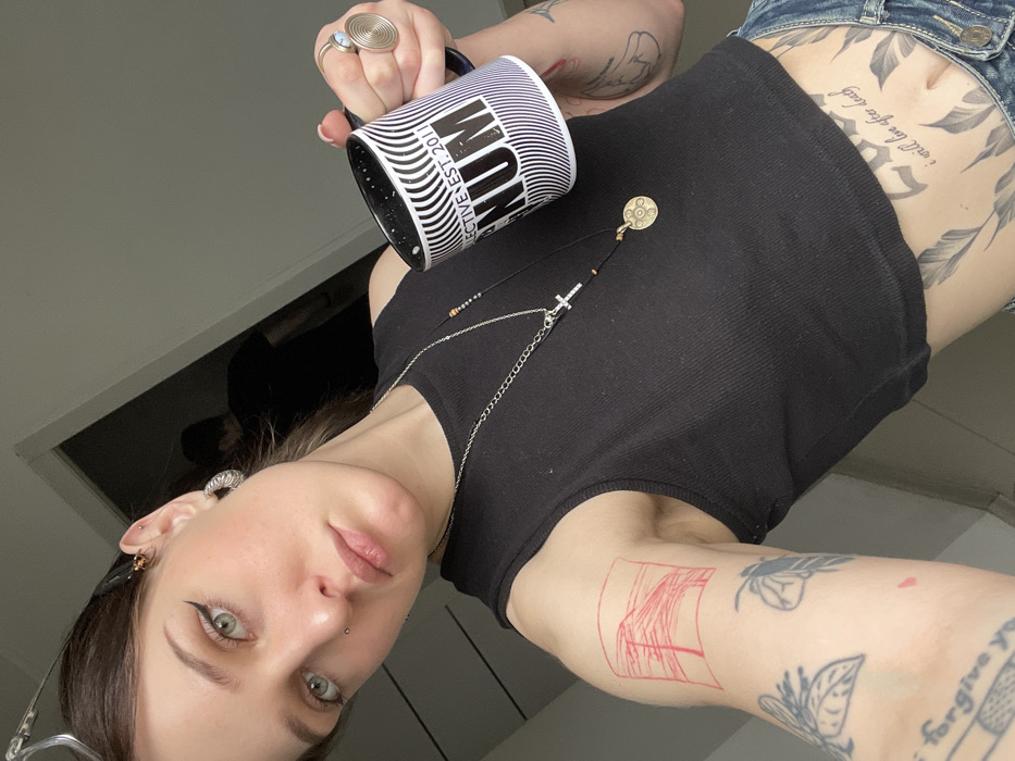 The image displays a selfie-style, close-up indoor shot of a young adult female, approximately mid-torso up, taken in Rostov-on-Don, Russia. The primary subject, a female with light skin, light green eyes, and dark hair pulled back, gazes directly at the camera with a neutral expression. She wears winged eyeliner and has a small silver stud piercing on the left side of her nose. Her left ear features a silver-toned hoop earring and multiple small piercings. She is dressed in a black ribbed sleeveless crop top and blue denim jeans, visible at the lower edge of the frame. Around her neck, she wears two necklaces: a silver-toned chain with a small, clear-stoned cross pendant, and a longer dark cord necklace adorned with small beads and a circular, possibly brass-toned, medallion pendant with an embossed design. On her right ring finger, she has a prominent silver-toned ring featuring a bluish-white stone set within a spiral metal design. Multiple tattoos are visible on the subject. Her left upper arm bears a red ink tattoo consisting of abstract lines within a rectangular frame. Her left forearm displays black ink tattoos, including leafy motifs and partially visible text, "i forgive you." Across her lower abdomen, just above the navel and beneath her crop top, is a black ink text tattoo stating "i will live after death," surrounded by additional black ink floral or leafy designs. The subject is holding a cylindrical, dark-colored mug in her right hand. The mug's upper rim is white with small dark speckles, and its body features a black and white striped optical illusion pattern. The text "COLLECTIVE EST. 2011 RUM" is prominently displayed on the mug. In the background, a light-colored wall is visible, with a doorway partially open on the right side. Within the doorway, a second individual, out of focus and wearing a dark shirt, is partially visible from behind or the side. The lighting in the scene appears consistent with an indoor setting.