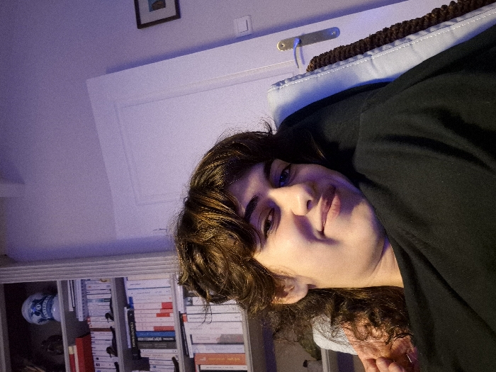 An individual with medium-length, wavy brown hair and bangs is depicted in a head-and-shoulders to upper-torso view, looking directly at the camera. The subject has fair skin, dark eyes, and a slight upward curve to the right side of the closed mouth, indicating a smile. They are wearing a plain black long-sleeved garment. The individual is seated or reclined in a light-colored upholstered chair, partially covered by a brown knitted throw or blanket. To the left of the subject, a white multi-shelf bookcase is visible, stocked with numerous books displaying spines of various colors, predominantly white, red, and black. A blue and white ceramic vessel and other small, indistinct objects are placed on the top shelf. To the right of the subject, a white interior door with a silver-colored lever handle is visible. A framed picture hangs on the wall above and to the right of the door handle. The room walls are painted a light lavender or pale purple hue, under interior artificial lighting conditions. This indoor scene is located in Châtelaillon-Plage, France.