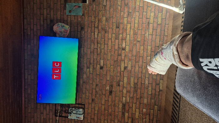 This image, captured in Melle, Belgium, presents a first-person perspective within an indoor setting. In the foreground, a person's right leg is visible, clad in grey sweatpants and a black t-shirt with partial white lettering. The right foot is enveloped in a white plaster cast, which displays various pink, yellow, and blue markings; the toes are exposed at the end of the cast. The leg rests above a dark floor featuring a patterned rug with diagonal black and beige stripes. The central feature is a large flat-screen television mounted directly onto a reddish-brown brick wall. The television screen displays the "TLC" channel logo in bold red letters against a background gradient of blue transitioning to green, with a smaller "TLC" identifier in the upper left corner. To the left of the television, a framed artwork featuring a line drawing is affixed to the brick wall. To the right of the television, a multi-colored, heart-shaped decorative object is present, followed by another framed piece of artwork depicting a stylized figure reaching towards a heart. A dark wooden paneled ceiling spans the upper portion of the frame. On the far right, a white, vertical light fixture or stand extends upwards from the floor.