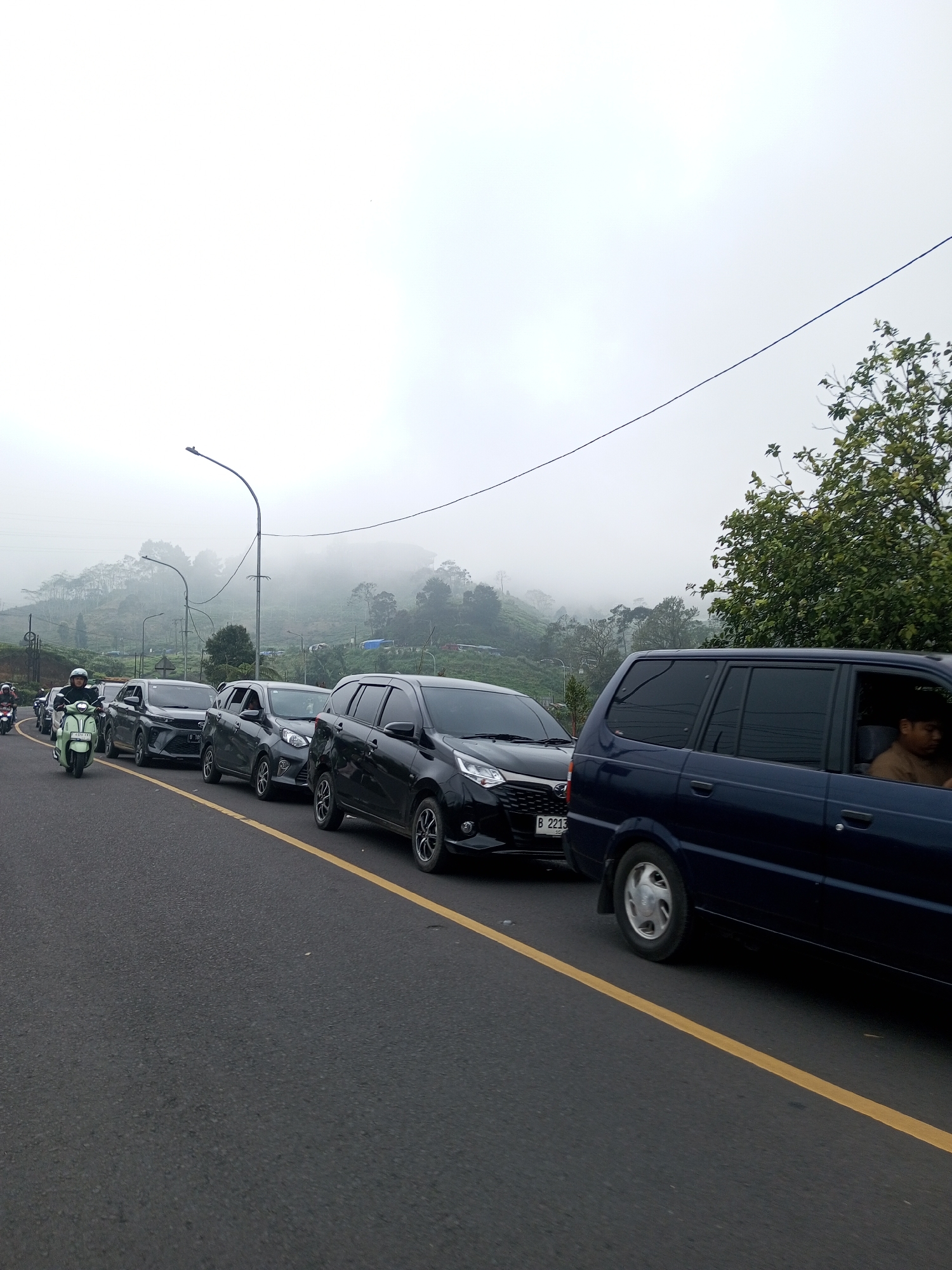 A line of cars and motorcycles is stopped on an asphalt road with a yellow dividing line. The sky is overcast and the hillside is foggy. There are several vehicles in the queue, including a light green scooter, dark-colored sedans, and a dark blue minivan. A utility pole is visible in the distance, as are trees. The license plate on the black car reads "B 2213". The environment suggests a mountainous area, potentially in the Mae Chan District, Thailand. A person is visible inside the blue minivan.