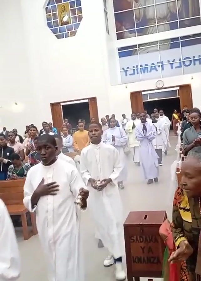 A crowd of people, primarily adults and children, are walking down the aisle of a church, toward the camera. Many are wearing white robes. The church has white walls, with windows depicting religious imagery. Some people are clapping. A donation box is in the foreground. The sign on the box says "Sadaka Ya Kwanza". “Holy Family” is visible above an entrance in the background.