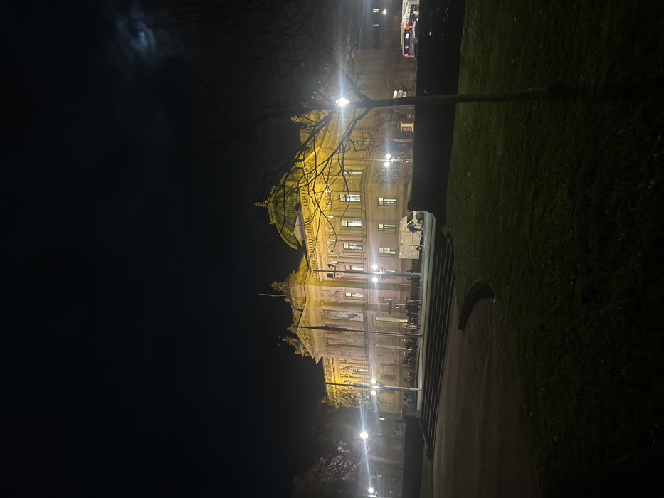 A grand, ornately decorated building, illuminated with warm lights, stands against a dark night sky, possibly with a visible moon above. The architecture features a dome-like structure and classical detailing. In front of the building, there's a park area with grass and a walking path. Trees, partially silhouetted, frame the structure. The image is taken at night, creating a dramatic contrast between the bright building and the surrounding darkness.