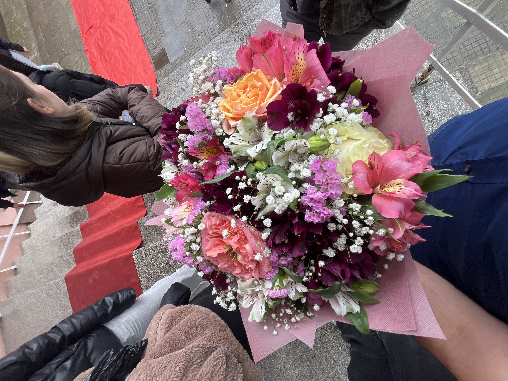 A high-angle shot shows a bouquet of colorful flowers held over a gray stone staircase covered partially with a red carpet. The bouquet includes pink, orange, white, and purple flowers with baby's breath. People are visible on the stairs and around the bouquet. One person wears a brown jacket. The setting appears to be an urban environment. The location, Yambol, Bulgaria, is not directly identifiable from the visual information.