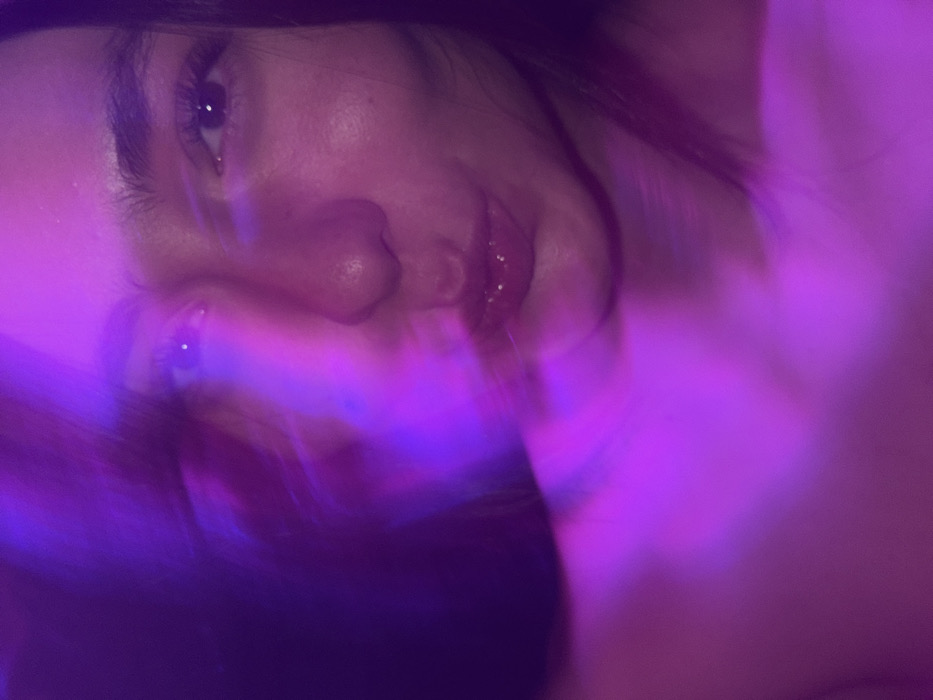 A close-up portrait of an individual, likely female, is depicted under intense artificial purple and pink lighting