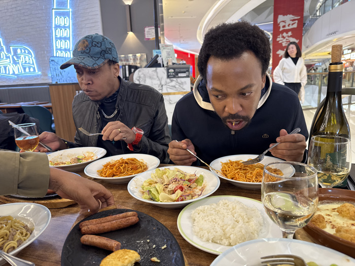 The image depicts an indoor dining scene at a restaurant in Daxing District, China, likely situated within a large shopping complex due to the visible high ceilings and open background. A prominent neon sign illustrating the Leaning Tower of Pisa and the Colosseum is visible in the left background. In the mid-ground, two adult males are actively consuming food. The male on the left, wearing a blue Gucci baseball cap, a black jacket, and a dark turtleneck, holds a fork over a plate of red-sauce pasta, with food in his mouth. The male on the right, sporting dark curly hair and a beard, is intently eating from a plate of red-sauce pasta, using both a fork and a spoon, with food visible around his mouth. He is dressed in a dark blue hooded sweatshirt. The wooden dining table is covered with numerous dishes. Visible items include multiple plates of red-sauce pasta, a plate of yellow pasta, a green salad, a serving of white rice, a black plate holding three cooked sausages and a partially consumed fried hash brown-like patty, and a casserole dish containing a cheesy or creamy preparation with fried pieces. Beverage containers include a partially full bottle of white wine with a cork stopper, a wine glass filled with white wine, and another glass holding an amber-colored liquid. The arm and hand of a third individual, clad in a brown sleeve, are visible in the lower-left corner, reaching towards the table. In the distant background, an adult female wearing a white top is standing, looking towards the left, with a partially visible red banner displaying Chinese characters behind her. The overall scene shows a group meal in progress within a well-lit establishment.
