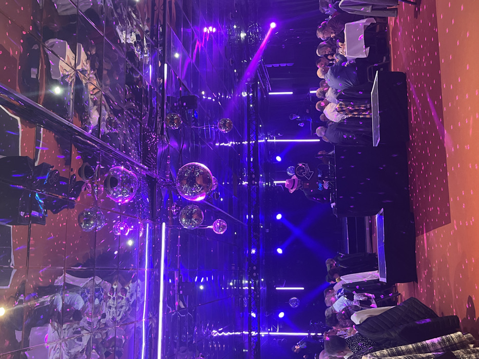 This image depicts an indoor evening event taking place in a large venue in Saint-Amand-les-Eaux, France. The room is characterized by extensive purple LED lighting, including horizontal strips on the ceiling, vertical bars on a stage, and spotlights, one of which casts a strong beam across the upper right. The ceiling consists of mirrored panels reflecting the lighting and numerous silver disco balls of various sizes, which are suspended throughout the space. The floor is covered with an orange-red carpet, displaying scattered white and pink light reflections from the disco balls. In the mid-ground, a DJ is positioned behind an elevated, black DJ booth, actively operating audio equipment. The DJ wears a pink fedora and a dark, patterned jacket. A white circular sign with a black arrow points rightward from the front of the DJ booth. Behind the DJ, a raised stage area features additional vertical light fixtures and crossed purple spotlights. Further to the right on the stage, another individual is visible near additional equipment. Throughout the mid-ground and background, multiple circular tables with white tablecloths are occupied by numerous attendees. Individuals are seated on dark chairs, engaged in conversation and facing each other, indicating a social gathering or dining event.