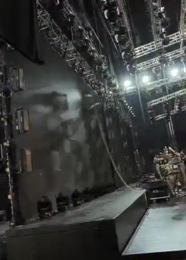 large concert stage being set up. A large LED screen displaying colorful abstract imagery dominates the view. Numerous stage lights are visible, both on the floor and suspended from the ceiling in an elaborate grid. A drum kit is set up on stage, and several people are moving around, presumably part of the stage crew. A second smaller screen is visible to the right. The stage floor is dark and reflective.