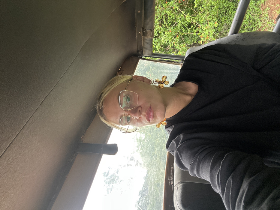 A forensic examination of the image reveals a fair-skinned individual, identified as a woman, seated inside what appears to be an open-sided safari-style vehicle. The setting is Situlpawwa, Sri Lanka. The woman is positioned centrally, facing directly towards the camera. She possesses blonde hair, pulled back, and wears large, gold-framed, square-shaped eyeglasses. Her lips are slightly parted, exhibiting a light pink or natural tone. Prominent, amber-colored, multi-petal flower-shaped earrings with silver-toned findings are visible on both ears. She is dressed in a dark, possibly black, long-sleeved garment, consistent with a sweatshirt or thick long-sleeved top. Her left arm is partially visible, bent at the elbow, suggesting she may be holding the camera or phone for a self-portrait. The interior of the vehicle features a light brown or tan padded roof liner, with visible stitching and a dark strap hanging down on the left side. A dark gray or black seat back is partially visible behind and to the left of the woman. To the right, through an open side of the vehicle, lush green vegetation is distinctly visible, including branches with small reddish-orange elements, possibly berries or flowers. The overall impression is an outdoor, natural environment, consistent with a safari or nature reserve setting.