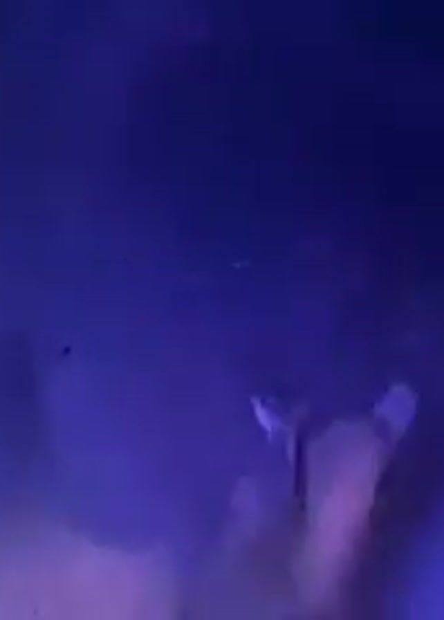 person in what appears to be a dark robe or garment with a white sash or band across their chest. The lighting is poor, with a predominant purple and blue hue. The person's face is obscured, but they appear to be looking down. The background is blurry and indistinct.