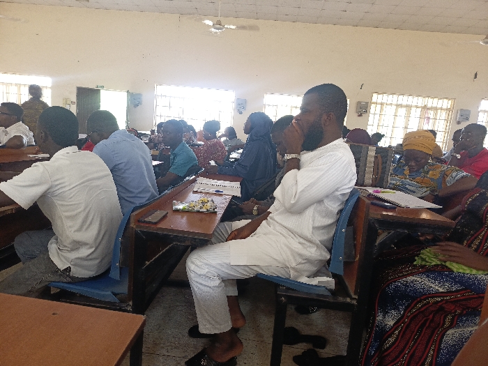 The image depicts an indoor scene within a utilitarian educational or meeting facility in Lafia, Nigeria
