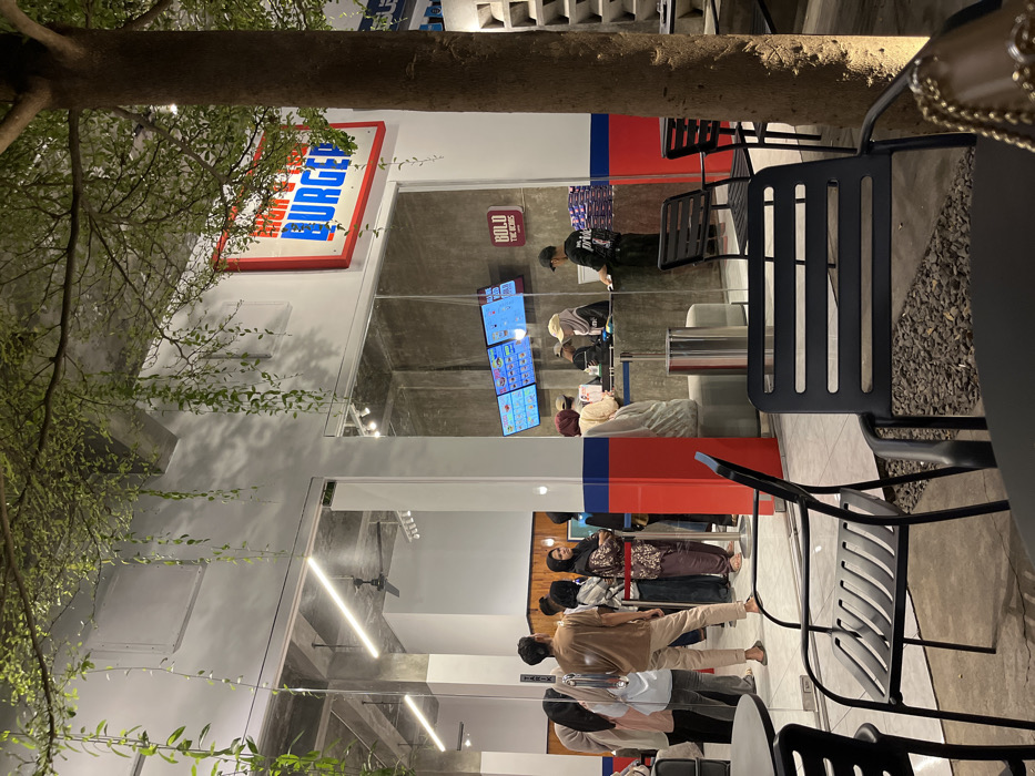 The image depicts an illuminated fast-food establishment in Lhokseumawe, Indonesia, likely at night. The foreground shows an outdoor dining area with several unoccupied black metal tables and chairs set on a ground composed of small dark gravel and concrete. A tree with green foliage partially obscures the upper right portion of the building and the sky. Green vines also hang from the white exterior walls of the building. The building's interior is visible through large glass panels, featuring a modern, industrial aesthetic with concrete walls and bright artificial lighting, including linear LED fixtures. A large red-framed sign with white and blue lettering reading "HIGH & LOW BURGER" is prominently displayed on the exterior wall above the glass entrance. Below this, inside, digital menu boards show food items. Another smaller red sign within the establishment reads "BOLD THE BONES." Inside the establishment, a queue of approximately ten individuals, appearing to be customers, stands in line to the left. Most individuals are dressed in casual attire, and several women wear hijabs. A red stanchion rope helps delineate the queue. To the right of the queue, three staff members are visible behind a counter. Two staff members, wearing caps, appear to be taking orders, one interacting with a customer at the counter. A third staff member, wearing a black uniform, is seen to the right, handling what appears to be boxed food items. A silver cylindrical trash receptacle is situated near the counter. The scene conveys active business operations at the burger restaurant.