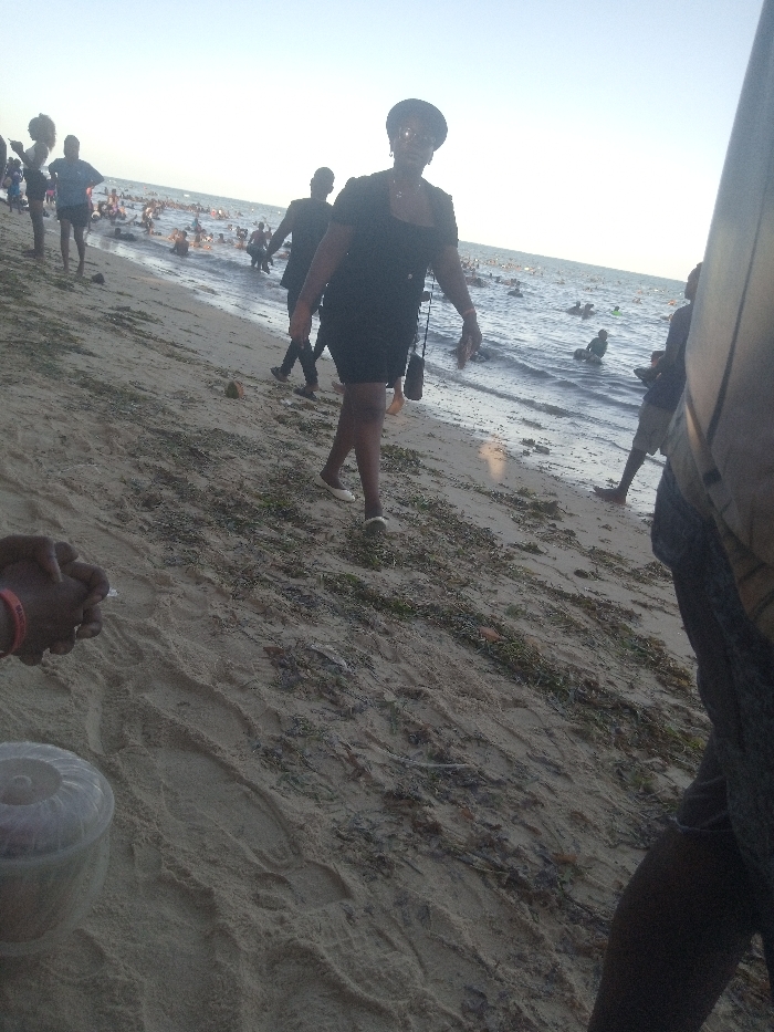 The image depicts a populated beach scene in Shanzu ward, Kenya, during daylight hours. The immediate foreground displays sandy terrain containing footprints and scattered dark organic debris, consistent with seaweed. To the lower left, two human hands, one with a red wristband, are visible near a partially obscured translucent plastic container. In the midground, a female subject walks along the wet sand, facing away from the camera's direct line of sight but angled toward the left. She wears a dark, short-sleeved top, dark shorts, and white flat shoes; a dark strap from an unseen item hangs from her shoulder. Ocular accessories are present on her face. Behind her, another individual in dark clothing walks on the sand. The background features a body of water, likely the ocean, with numerous people wading, swimming, or floating. The horizon line is visible under a clear, light-colored sky. A partial view of a human leg and clothing is present along the far right edge of the frame.
