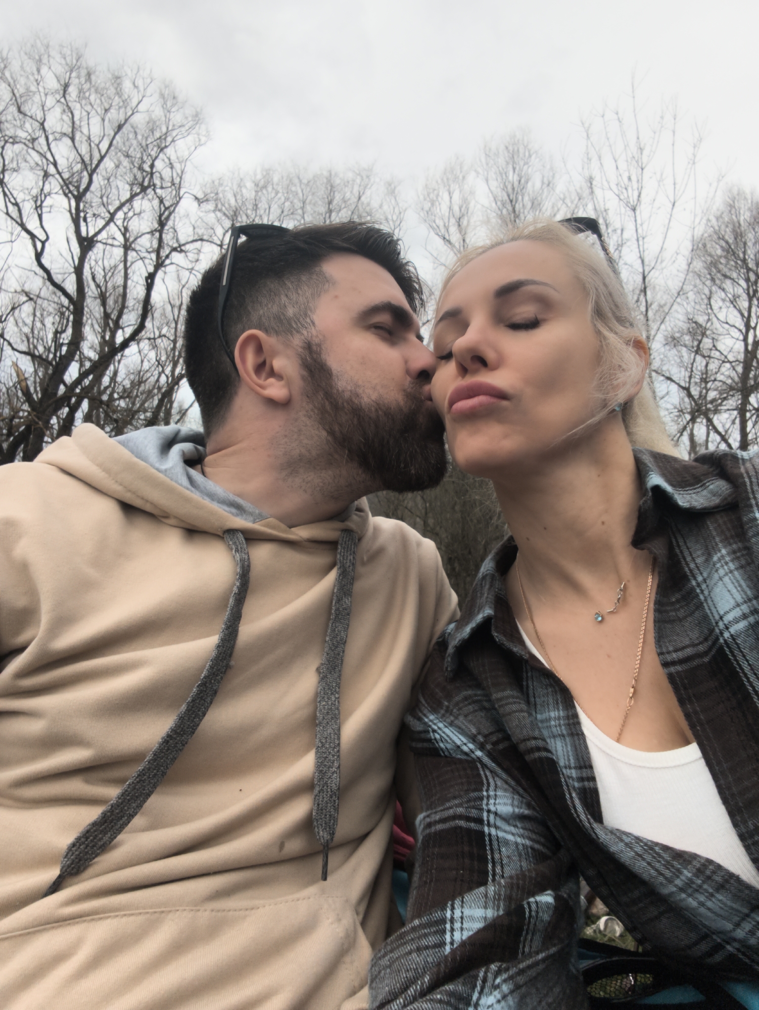 A man with a dark beard is kissing a blonde woman on the cheek. The woman's eyes are closed and her lips are pursed. The man is wearing a tan hoodie and has sunglasses on top of his head. The woman is wearing a white tank top and a blue and black plaid shirt, along with two necklaces. Trees are visible in the background under a cloudy sky. The location is likely in the city of Орлиновский округ, Ukraine.