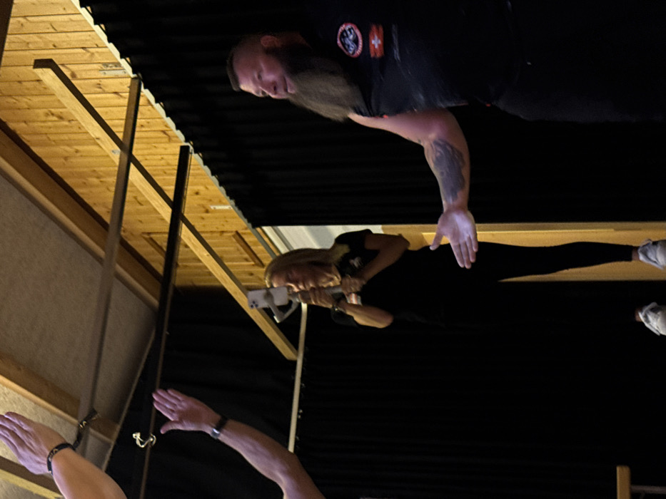 The image depicts an indoor scene in Reisenberg, Austria, featuring three individuals and a recording setup, set against a backdrop of black curtains and a wooden ceiling. In the foreground, on the left, two arms are raised, seemingly in a gesture of waving or applause. The upper arm wears a dark wristband, and the lower arm displays a dark wristband or watch. To the right of center, a blonde woman, facing towards the right, holds a white smartphone mounted on a grey gimbal stabilizer, suggesting video recording. She wears a black t-shirt, dark leggings, and white sneakers. On the far right, a bearded man with a dark mohawk-style haircut faces left, extending his right arm outwards with an open palm. He wears a dark sleeveless top featuring a patch with a red and white cross, indicative of the Swiss flag, and other symbols on the left chest. A tattoo is visible on his right forearm. The background consists primarily of dark black stage curtains. Above, a wooden slatted ceiling or wall section with exposed wooden beams is visible, with some metal hardware attached. Artificial lighting illuminates the subjects.