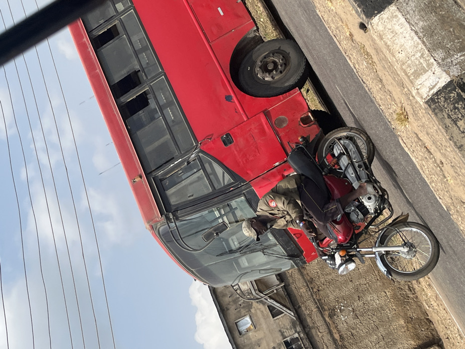 An outdoor scene in Lokoja, Nigeria, depicts a male motorcyclist alongside a large red bus on a paved road, captured with a diagonal composition under a pale blue sky