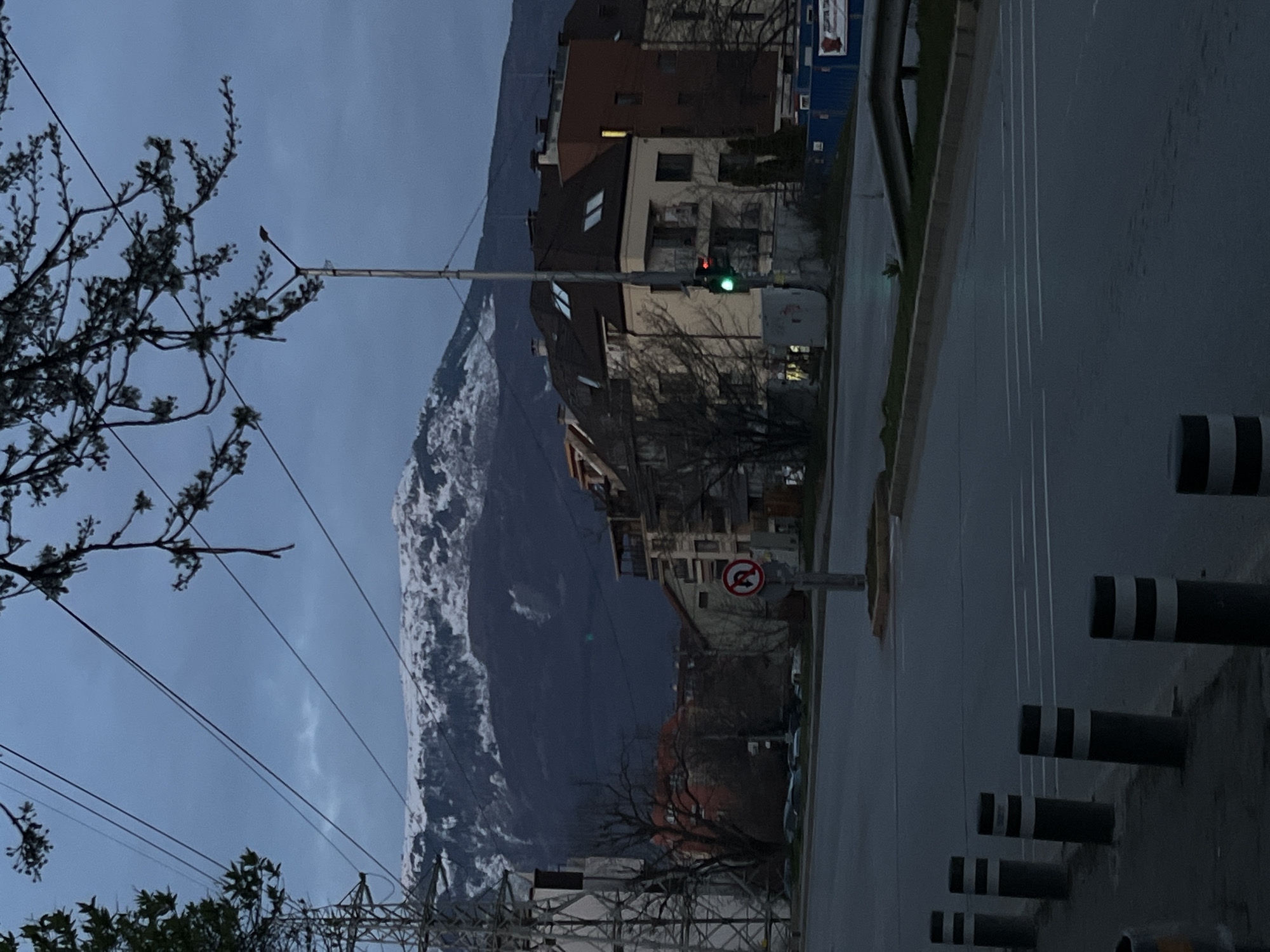 An urban street scene in Sofia, Bulgaria, is depicted at dusk or dawn, with Vitosha Mountain prominent in the background. The sky is overcast and blue-grey. The mountain's upper slopes are snow-covered, while its base appears dark and forested. In the foreground, a multi-lane asphalt road occupies the lower half of the frame. White road markings are visible on the dark pavement. A row of dark bollards with white reflective stripes lines the left edge of the road. A "No Left Turn" traffic sign (white circle, red border, black arrow with a red diagonal line) is mounted on a pole near the road's center median. Adjacent to this pole, a traffic light displays a green signal. No vehicles or pedestrians are present on the road. To the left, a metallic lattice power transmission tower is partially visible, with multiple power lines stretching across the upper left sky. Bare tree branches with small buds extend from the top and left, partially obscuring the sky and mountain. In the midground, behind the road, a series of multi-story buildings are visible. These structures feature varying facades, including cream-colored and reddish-brown sections, with dark roofs punctuated by skylights. One window in a brown-red building shows internal illumination. Bare trees stand between the buildings. On the far right, blue construction barriers are discernible. A streetlamp with a single fixture stands vertically near the traffic light.