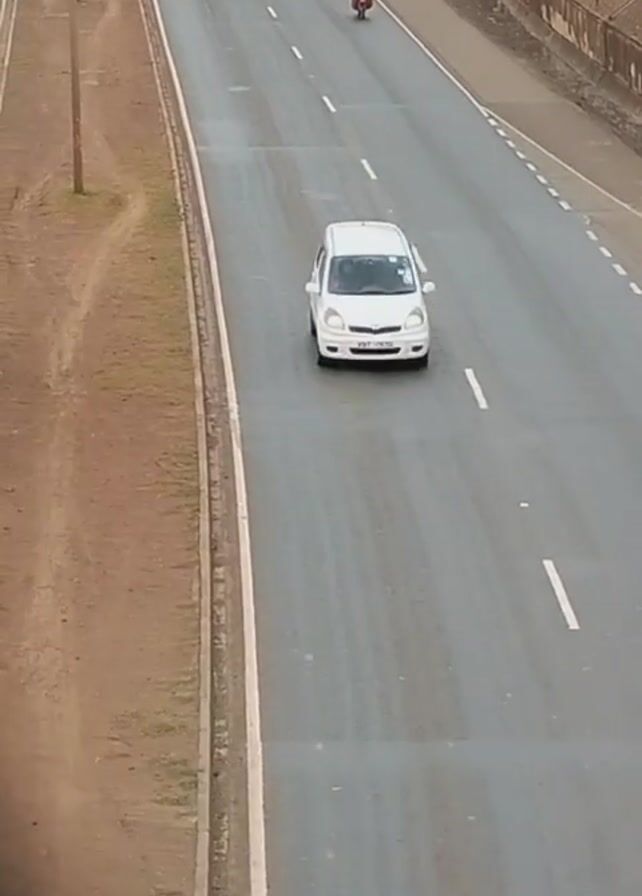 four-lane road with a white car, a yellow truck, and a red motorcycle moving in the same direction. A green truck is moving in the opposite direction. The road has a center median with grass and dirt. The video is taken from an elevated position. There are people walking on the side of the road.
