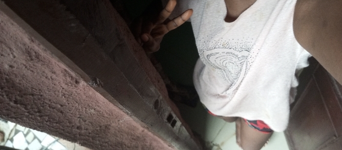 A person wearing a light-colored tank top is visible. The individual is making a peace sign with their fingers. A rough, brown wooden beam appears in the foreground. The background is dark and partially obscured, suggesting an interior setting. The image is taken at an odd angle.