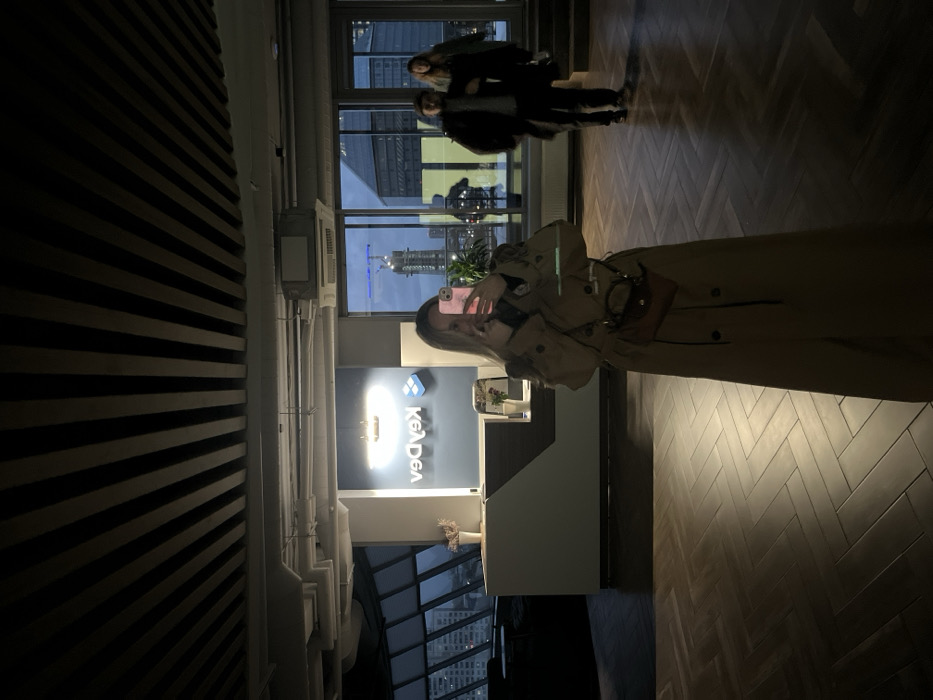 The image portrays an interior view of a modern office or lobby, identified as the Dev.by office located at Pobediteley Avenue 7A, Royal Plaza, Minsk, Belarus. This identification is based on the prominently displayed, reversed "KeVDeV" (Dev.by) logo and stylized cube symbol, which is backlit on a light gray wall behind a two-toned white and dark wood reception desk. In the foreground, a young adult female with light-colored hair is centered, capturing a mirror selfie with a pink-cased smartphone held in her left hand. The phone's screen emits a distinct pink light onto her face. She is dressed in a long, light-colored trench coat and carries a small brown handbag over her right shoulder. The reception desk is adorned with a small vase containing dried flowers on the left. Through large, floor-to-ceiling windows to the right, a city skyline at dusk or night is visible under a dark blue sky. The exterior view includes multiple high-rise buildings and a construction site featuring a blue-illuminated crane. Two additional individuals are seen in the background near the windows: a male in a dark coat and cap, and a female with light-colored hair, both walking towards the left. The interior space features dark, herringbone-patterned wooden flooring and a ceiling constructed with dark, parallel slat panels. White exposed ventilation ducts and an air conditioning unit are mounted near the ceiling above the windows. To the far left, a dimly lit lounge area with dark seating is discernible through additional angled windows. The overall lighting within the scene is subdued, originating from internal fixtures and ambient city lights.