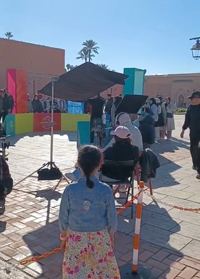 film or television set in an outdoor public square. A group of people, including a child, are standing and watching the production. The set includes colorful backdrops with the words "Africa's GOT talent" on them, as well as professional filming equipment, including a camera, a large light diffuser, and a rolling cart with equipment bags. The area is roped off with orange and white safety barriers. The square is paved with brick, and palm trees and buildings can be seen in the background under a clear blue sky.