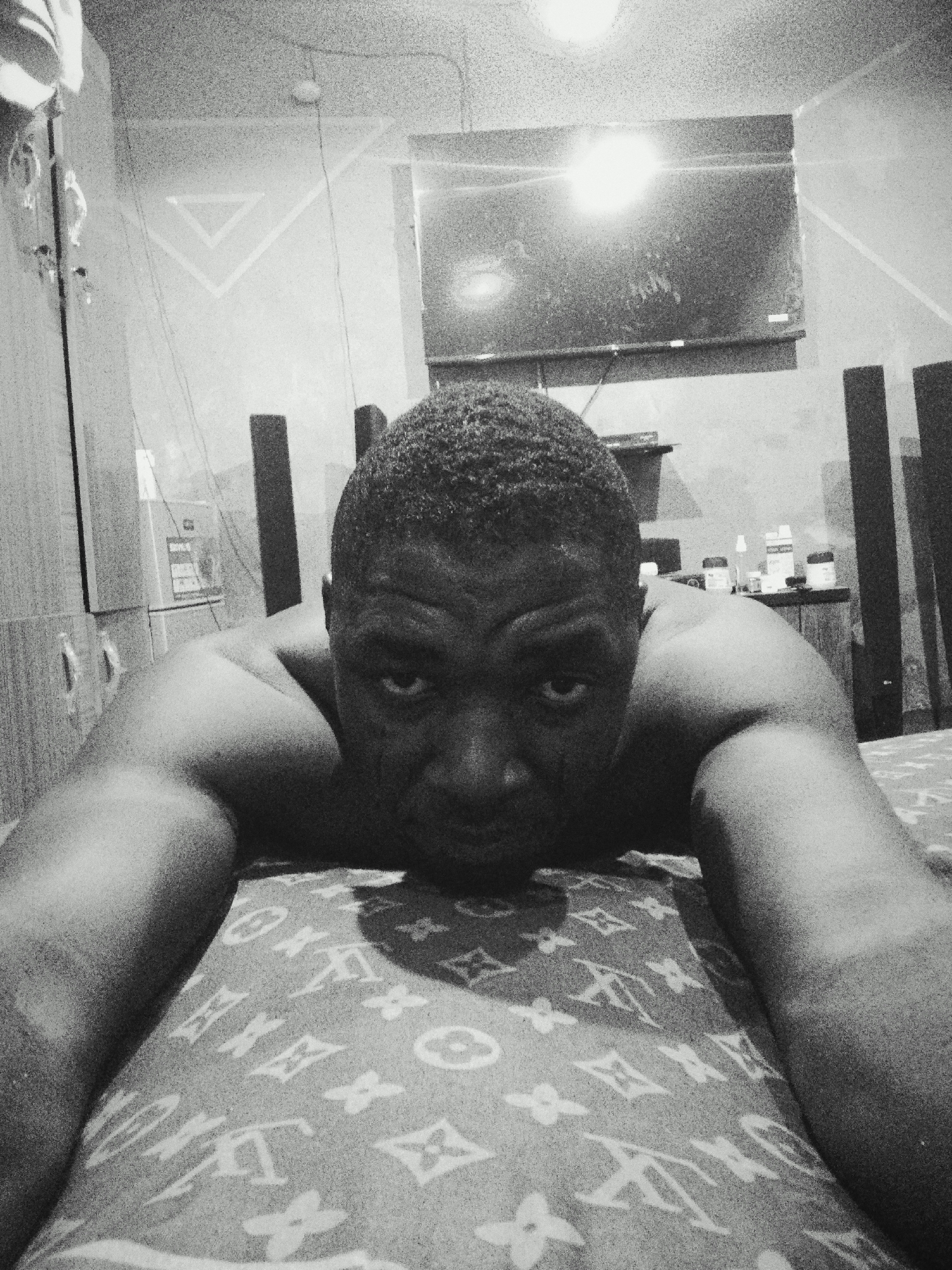 A monochrome image depicts a shirtless Black male lying prone on a bed, propped on his forearms, with his head facing the camera. He maintains a direct, intense gaze. Distinct scarification marks are present on his cheeks. The bed is covered with a sheet patterned with repeating symbols resembling the Louis Vuitton monogram. The scene is set indoors, within a room in Gawuna, Nigeria. In the background, a flat-screen television is mounted on a light-colored wall, flanked by two tall, dark, rectangular speakers. A bright, circular ceiling light fixture illuminates the room from above. To the right of the television, several bottles and containers rest on a surface. On the left wall, a prominent inverted 'V' geometric pattern is visible, adjacent to a partially obscured wooden cabinet or wardrobe. Visible wiring runs along the walls and ceiling.